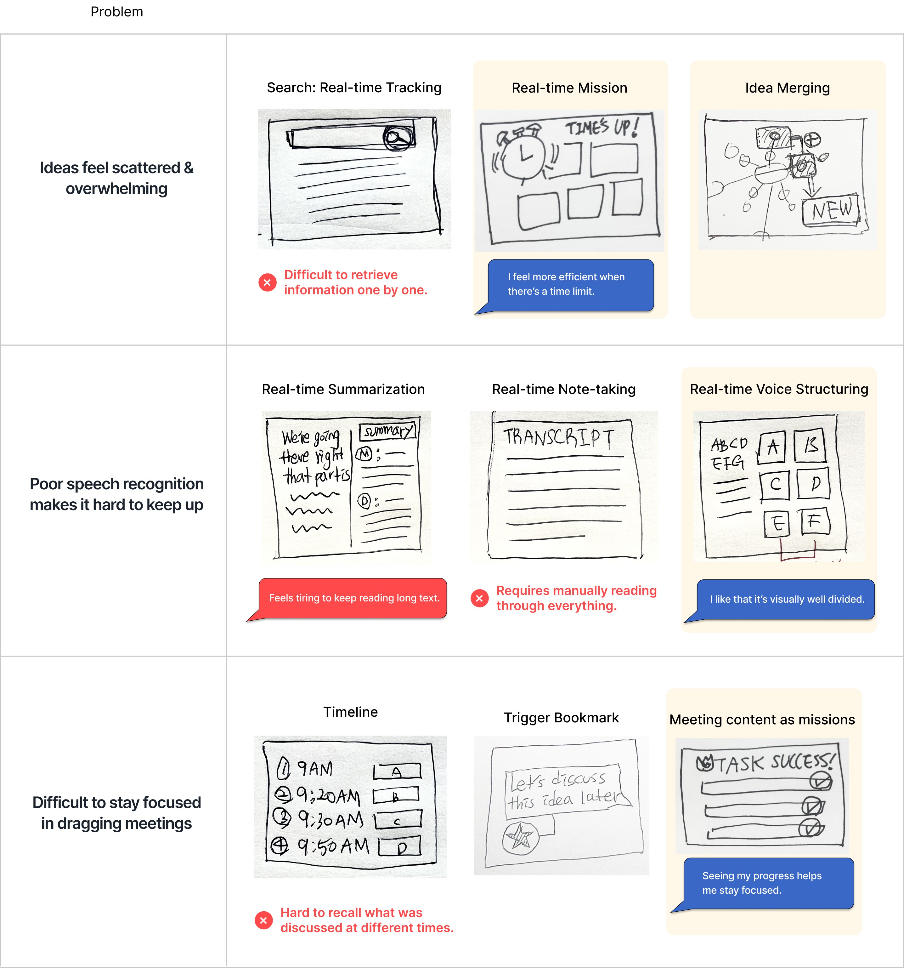 With rapid topic shifts and no structural anchors, they easily lose context and experience heavy cognitive load trying to record, speak, and interpret all at once.