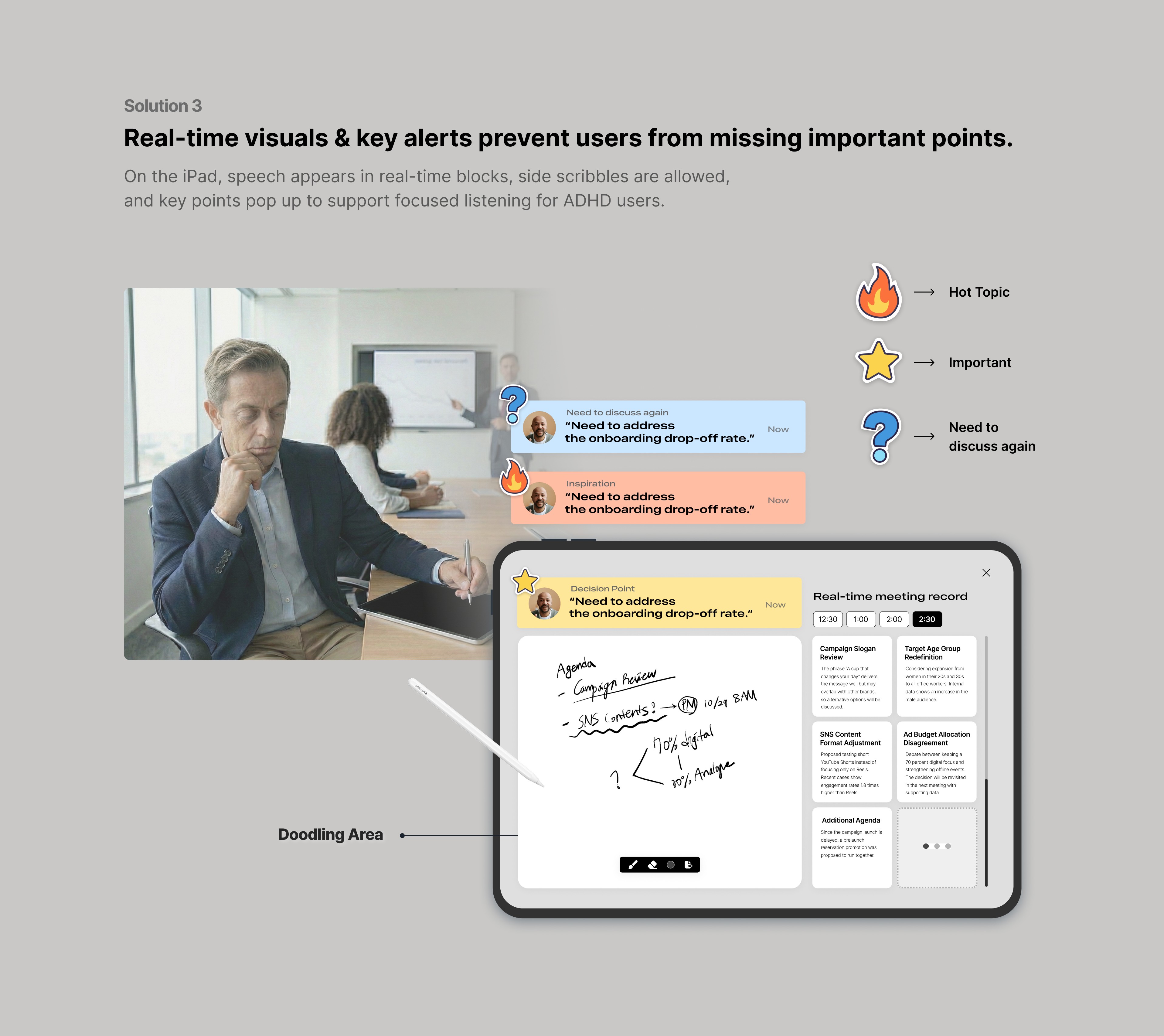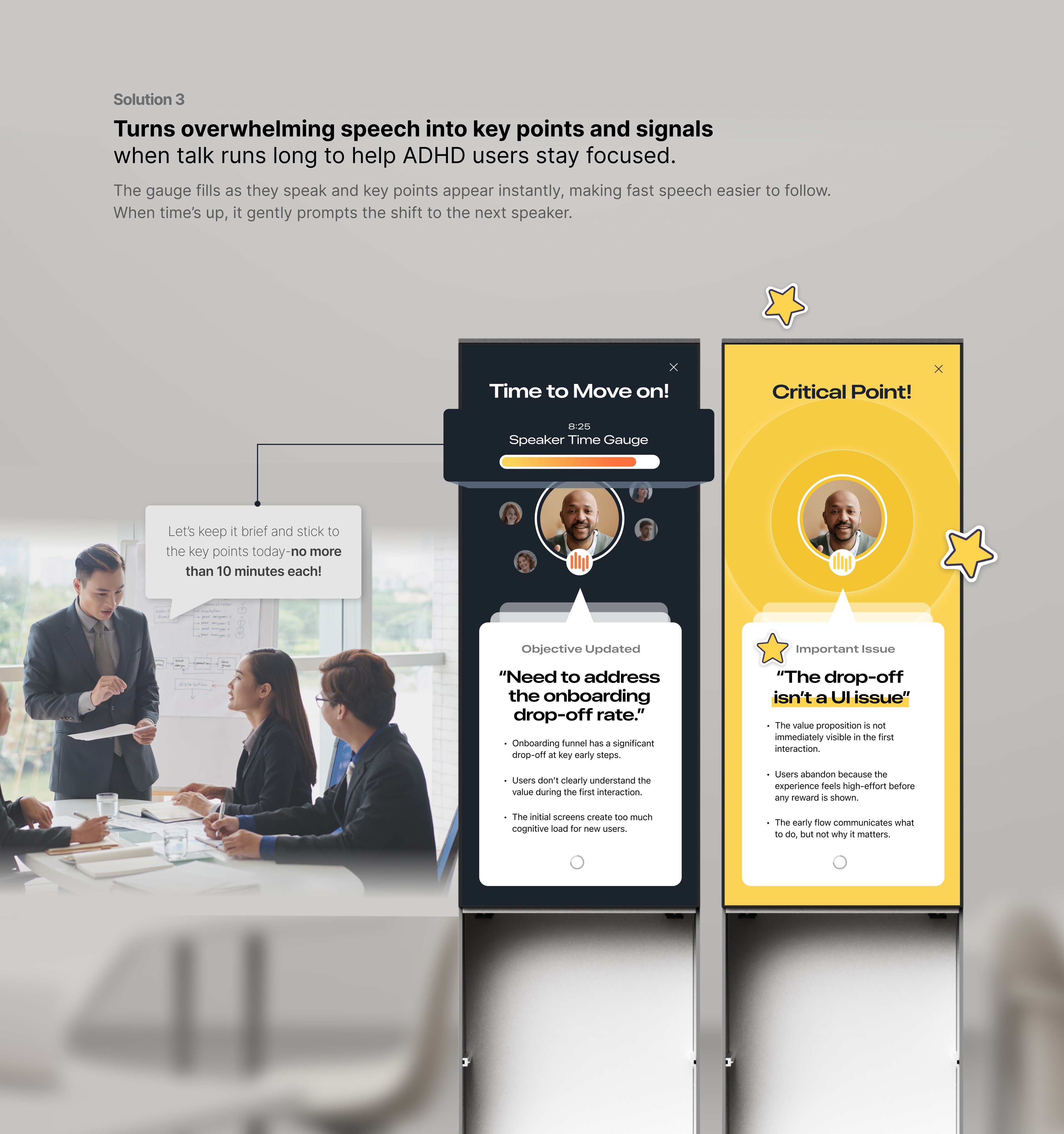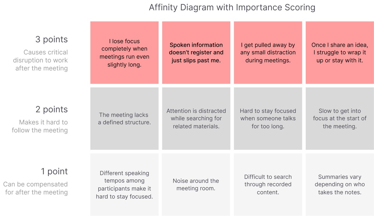 In meetings, ADHD users struggle to stay focused when ideas mix too fast.