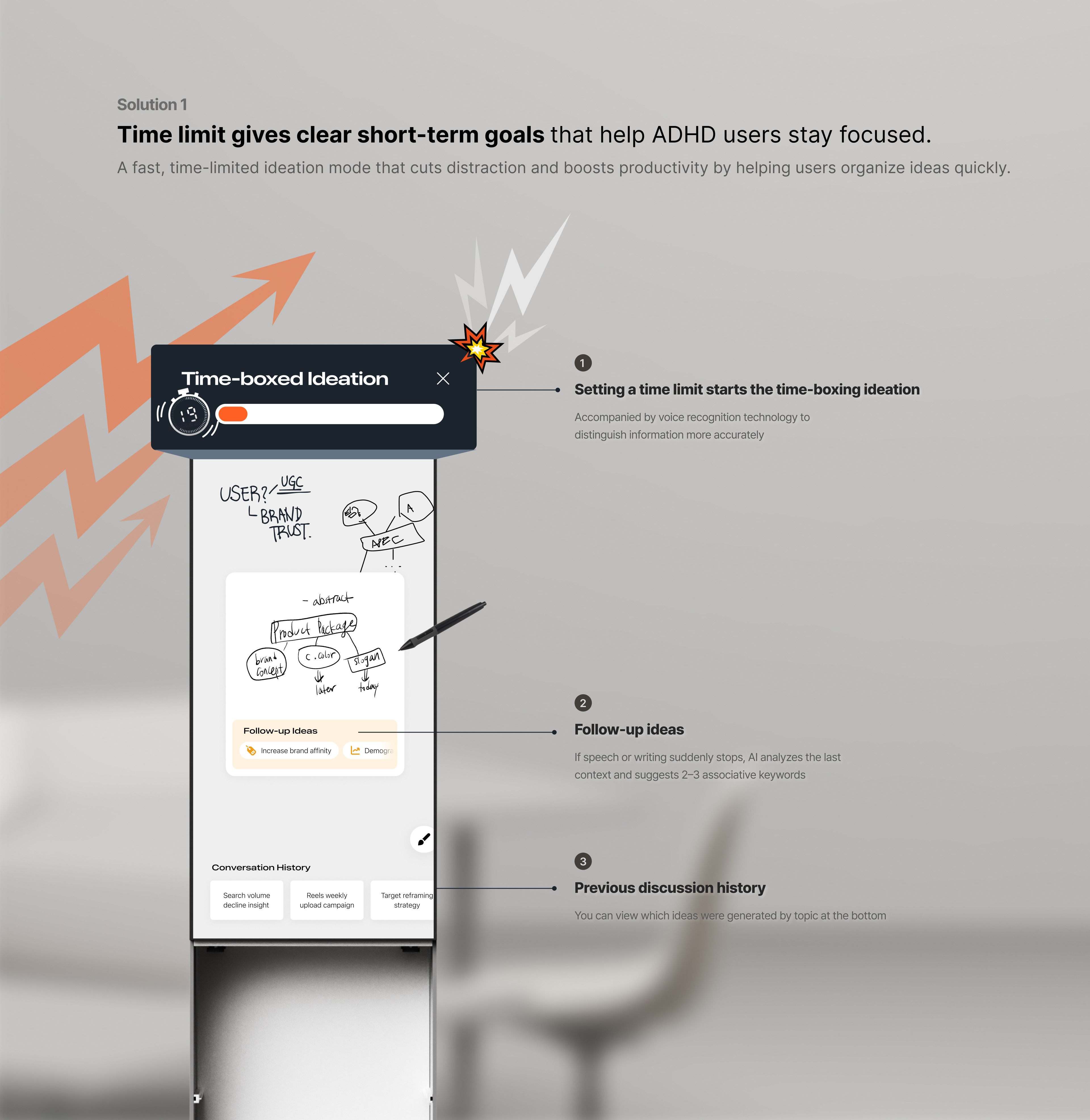 I realized that true accessibility is not about compensating for limitations but about amplifying users’ strengths. For ADHD users, spontaneity and visual thinking are not distractions but sources of creative potential. This led me to propose a new hardware form that could instantly visualize spontaneous thoughts and respond to their unique rhythm of thinking.