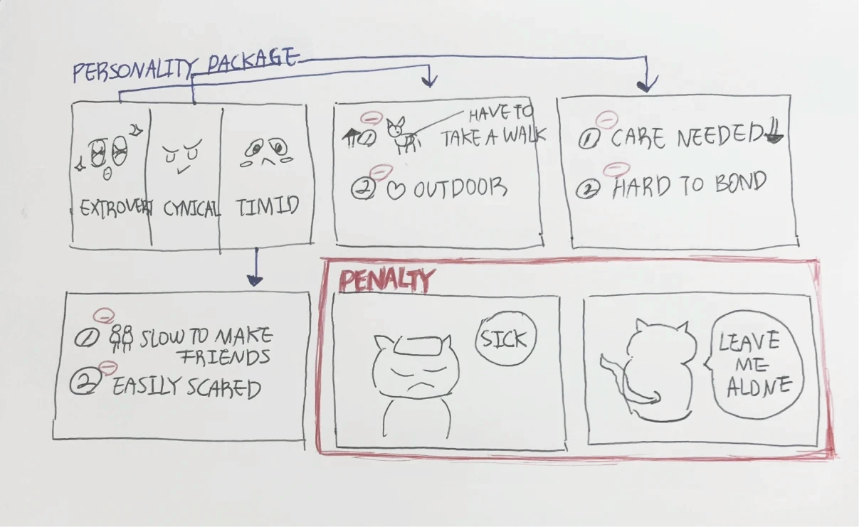 Pet character and core game element sketches.